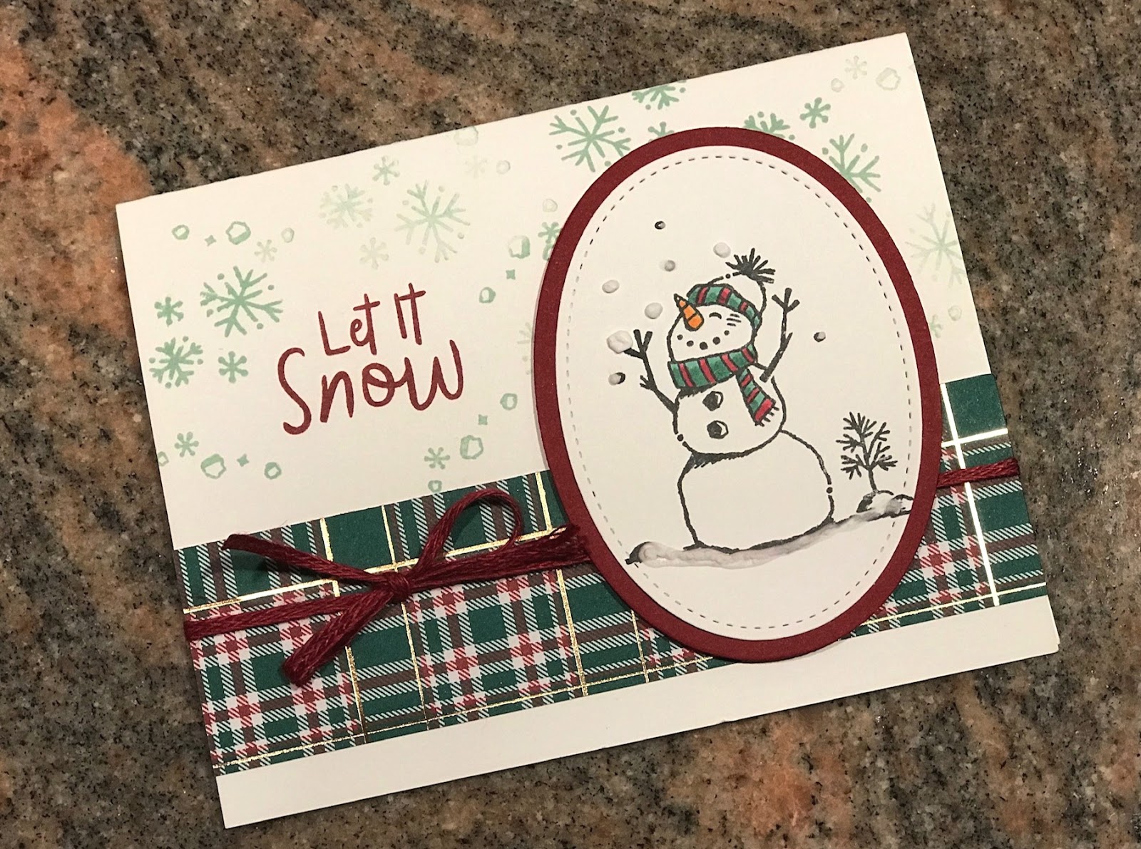 In my pre-order, I got this adorable snowman bundle. I created two cards, one using the punch to build a snowman and one was stamped on a Stitched Oval.
